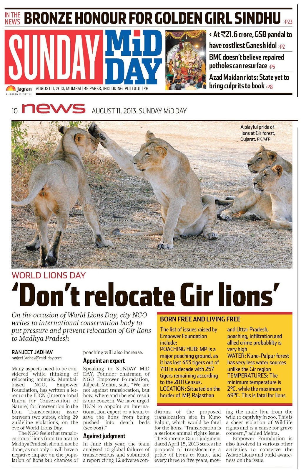 Speaking to SUNDAY MiD DAY, Founder chairman of NGO Empower Foundation, Jalpesh Mehta, said, “We are not against translocation, but how, where and the end result is our concern. We have urged IUCN to appoint an international lion expert or a team to save the lions from being pushed into death beds (see box).â€